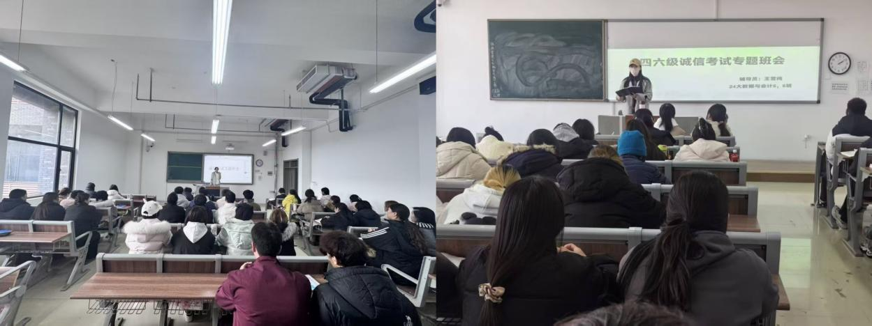 动员活动覆盖学院所有专业和班级。辅导员结合专业特点和学生实际,围绕考试纪律、违规后果、备考方法、心理调适等方面开展针对性指导,并系统解读《国家教育考试违规处理办法》和学校相关规定,通过真实案例警示考试作弊的严重后果。同时,各专业优秀学生代表也分享了听力训练、阅读技巧、时间分配等实用备考经验。多场动员会还设置了“诚信宣誓”环节,引导学生签署《诚信考试承诺书》,强化自我约束意识。
