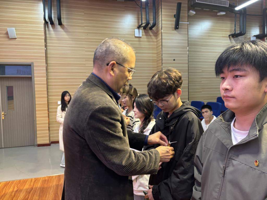 由党总支副书记张倩、团总支书记荣婉晴、团总支副书记及学生会主席一同为新团员代表佩戴上团徽。