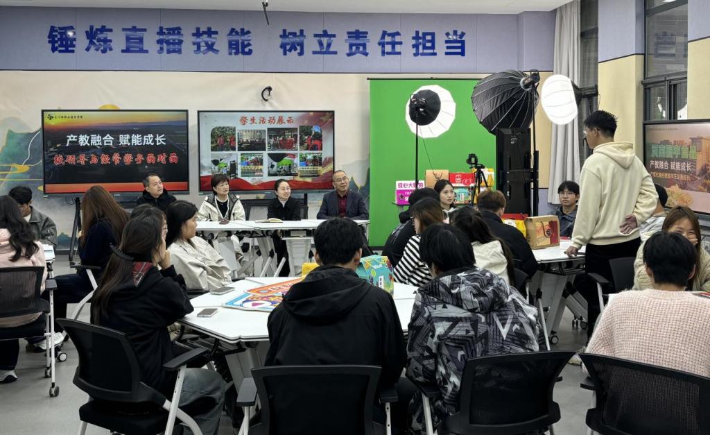 在座谈会现场,全媒体运营直播社团指导教师任晶洁率先对学院校企合作的最新成果进行讲解与展示。通过与河南宏福食品、帅华果醋等企业合作的详实数据和典型案例,充分展现了学院在产教融合领域的实践成效。随后,全媒体运营直播社团社长安静怡同学开展直播技能展示,其娴熟的专业技能与自信的现场表现,赢得了与会人员的高度认可。