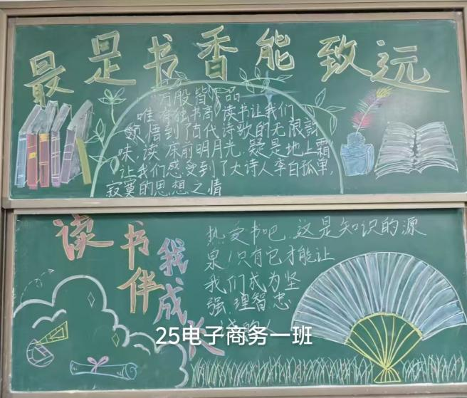 比赛过程中,各班学子充分发挥创意与巧思,围绕“名著推荐”“阅读心得”“读书故事讲述”三大核心内容展开创作。笔下文字或点评经典名著的深刻内涵,或分享个人阅读时的感悟共鸣,或讲述与书籍相伴的温暖故事;搭配协调的色彩、精致的插画,让一块块黑板报成为传递阅读力量的生动载体,营造出浓厚的班级读书氛围。