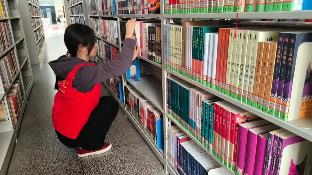 活动现场,志愿者们身着统一红马甲,精神饱满、热情高涨。大家明确分工、默契协作,有条不紊地开展各项服务工作:有的按照图书分类编号细致整理错乱书架,将散落书籍逐一归位、规范摆放,确保书目整齐有序、方便师生查阅;有的手持清洁工具,认真擦拭书架、桌面、窗台及公共阅览设施,仔细清理角落灰尘与杂物;还有的主动引导往来读者文明借阅,轻声提醒保持安静,协助维护阅览秩序。