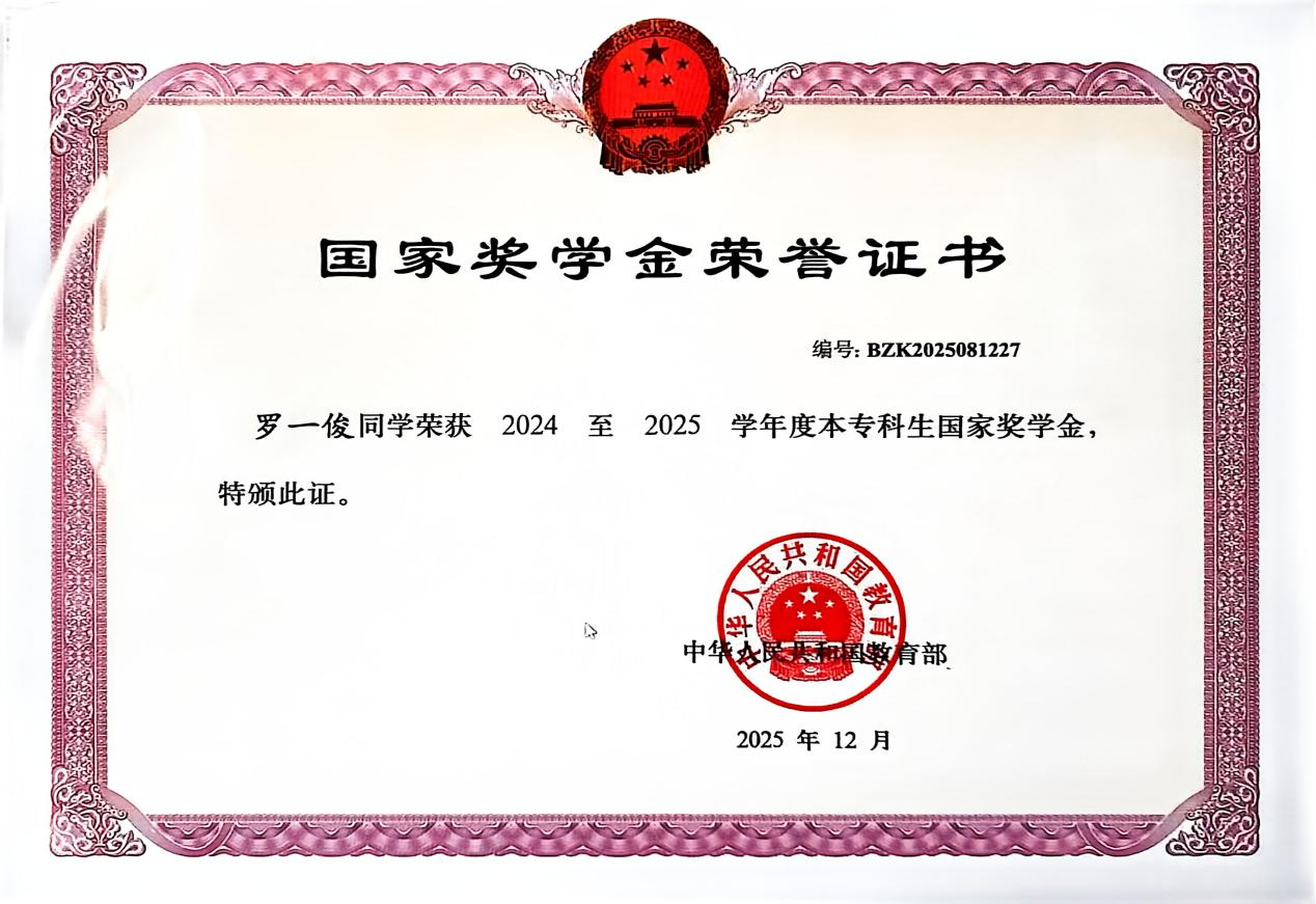 学习上,罗一俊笃行不怠、深耕专业,课堂认真钻研,课后勤学苦练,专业成绩连续两年名列前茅,先后荣获国家励志奖学金、国家奖学金。为提升学历、拓宽发展道路,合理规划时间,高效备战专升本,以坚持与汗水追逐梦想。